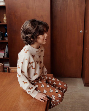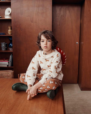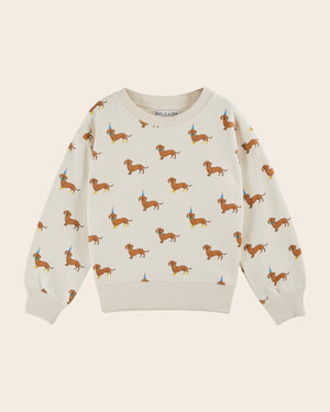 Caramel dachshund sweatshirt with yellow boots, green bow ties and blue pointy hats. It's party time with the dachshunds!