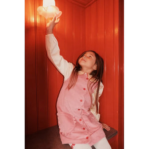 The blouse has a large collar with red lace edges, red heart-shaped buttons at the front and discreet puff sleeves with elastic at the bottom.