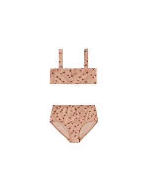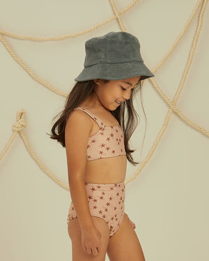This two-piece bikini features a wide spaghetti top and vintage inspired, highwaisted bottoms.