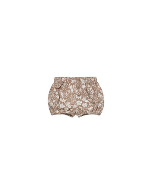 Woven shorts featuring buttons on the front. Elastic waistband and leg openings create a bubble silhouette easy for changing.