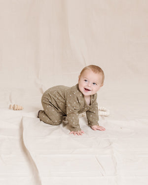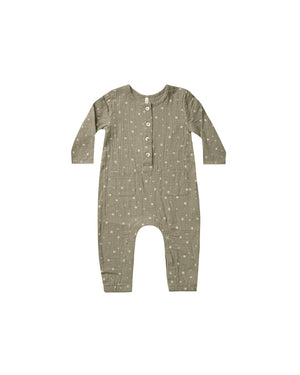 Long sleeve jumpsuit with wood buttons down the chest, and hidden snaps along the inseam for easy changing.