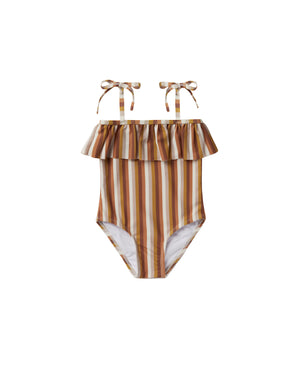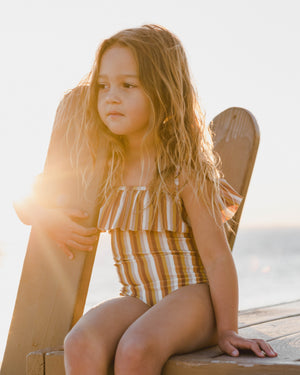 This one-piece rashguard swimsuit will have your little one protected from the sun in style. Featuring a zipper front closure and ruffle details at the leg openings.
