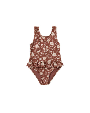This one-piece swim features a ruffle flutter detail on the waist and a scoop back for a cute and classic look.