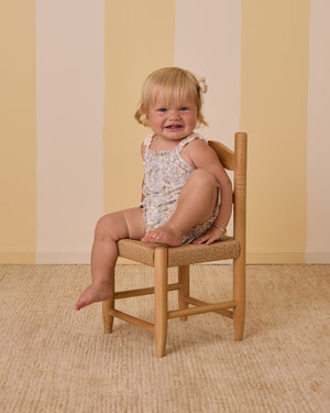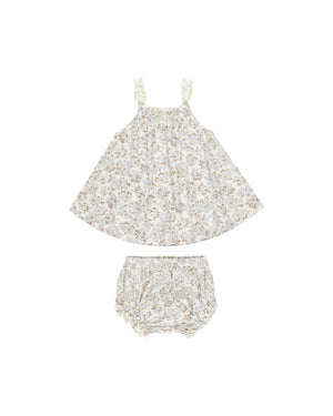 This set has a cute swing tank top featuring ruffled spaghetti straps and a gathered neck. Paired with matching bloomers.