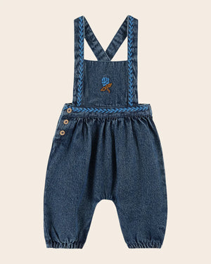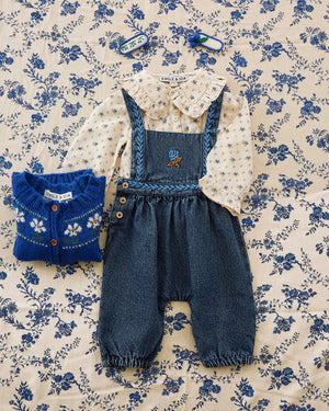Baby overalls in blue denim cotton embroidered with blue leaf garlands on the waistband and all along the straps framing the bib, and a blue rose, embroidered in cross-stitch, brightens up the center of the bib.