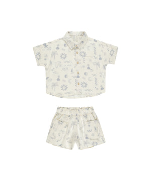 Our light and flowy Kelli Set features a button-down shirt with a drop shoulder and wide-leg shorts with an elastic waistband.