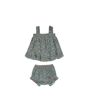 Our Lala Set is the sweetest look for warm days. Featuring smocked and ruffle detail, a tulip back opening with center back buttons, and matching flutter bloomers.