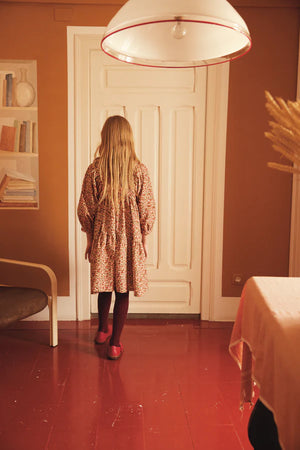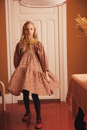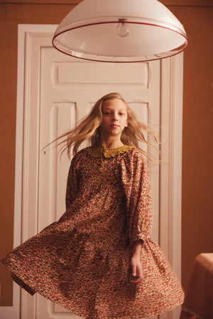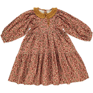 A favorite of the season, the lovely Lyra dress is in the beloved Bebe Organic silhouette. Features oversized long sleeves, adorable painted hearts print in hues of red, pink and green, elegant loose fit, ruffled hemline and adorable crochet collar. Closes in the back with mother-of-pearl buttons. And as always, flouncy skirt - perfect for twirling.