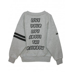 on the back there is a print with the phrase: 'LIVE YOUR LIFE OVER THE RAINBOW'
