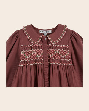 The gathers, generated by the smocks, flare out freely to the bottom of the dress.