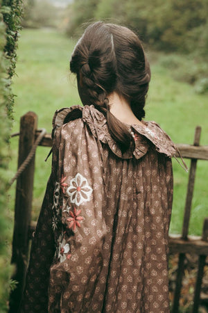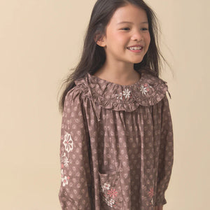 Side pockets are perfect for collecting tiny treasures, and soft elastic at the wrists finishes the sleeves with a gentle ruffle. The skirt falls just above the knee with a ruffled hem and subtle side slits—made for crisp mornings, cozy afternoons, and everything in between.