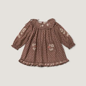 A returning favorite, the Belle Dress is reimagined this season in one of our signature textured block prints. An oversized Peter Pan collar gathers at the neckline with a delicate ruffle and drawstring tie, while faux bows at each shoulder nod to vintage silhouettes.