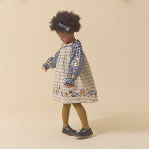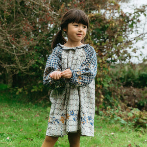 A beloved silhouette returns—this time in our custom double-sided fabric, inspired by vintage Indian woven blankets. The textured weight and warmth make it perfect for crisp fall days, while the clever use of both sides of the fabric creates playful color-blocking throughout. Finished with cheerful embroidery, this dress is cozy, nostalgic, and full of whimsy—sure to become your little one’s favorite. 100% Double layered cotton