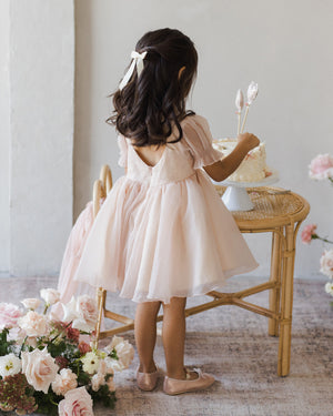The Valentine Dress lives up to its name with an elegant heart-shaped back cutout topped with a button closure. Organza sleeves and skirt make this new silhouette a season favorite.