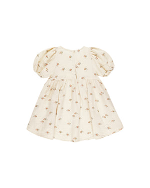 This adorable dress features pretty puff sleeves and a baby doll inspired silhouette with a curved waistline, scooped neck, and button back closure.