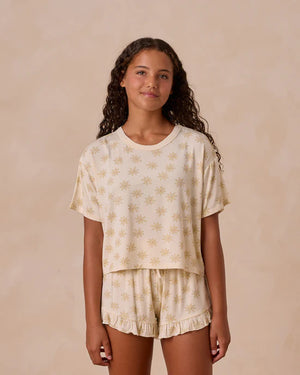 Lounge away your summer days in this cozy set - a drop shoulder top and matching shorts with ruffle detail at the hem.