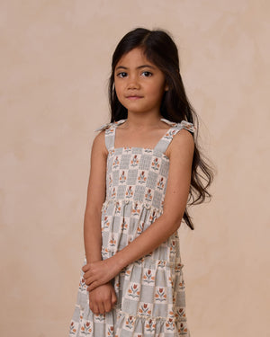 Four tiers with ruffled seams, a smocked bodice, and fixed bow straps come together to make our delightful Taylor Dress.