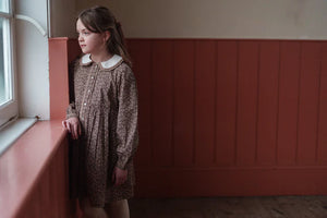 This beautiful vintage-inspired dress with full skirt, is made in our organic, bracken floral print fabric. It has long, full sleeves finished with neat little button cuffs, and a contrasting collar with double row of gathered cotton trim. The front button placket has gathered cotton trim either side of it.