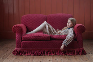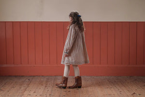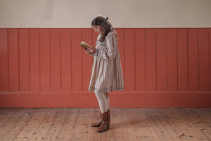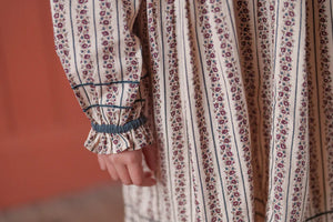 This beautiful vintage-inspired dress, is made in our organic, mallory floral print fabric. It has long, full sleeves finished with ruffle cuffs, a cotton velvet peter-pan collar with cotton trim stitching, and two rows of velvet ribbon to the sleeves and hem. The front button placket has a single row of buttons and loops, either side of which are beautiful, hand-smocked panels.