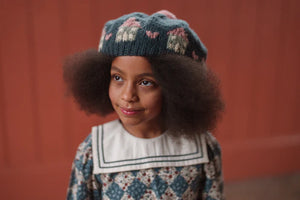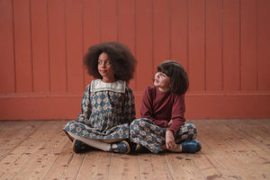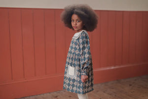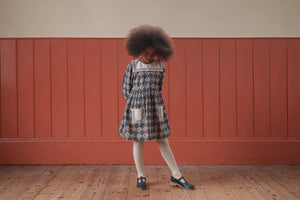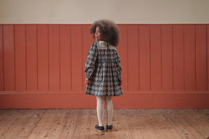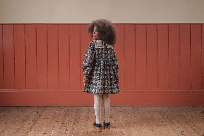 Our beautiful Eva sailor dress is made in our organic harlequin fabric. It has a contrasting, white sailor collar with a double row of velvet ribbon, full sleeves finished with neat little button-up cuffs, and contrasting patch pockets also with velvet ribbon trim. The dress fastens with buttons to the back.
