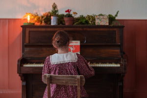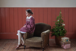 This beautiful vintage-inspired dress, is made in our organic clove floral print fabric. It has long, full sleeves finished with frilly cuffs, and a cotton sailor collar with gathered lace trim. The front button placket has a double row of buttons, either side of which are beautiful, hand-smocked panels