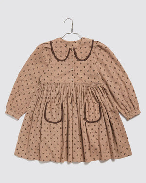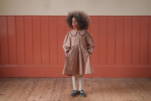 This beautiful vintage-inspired dress with very full skirt, is made in our organic, rosehip floral print fabric. It has long, full sleeves finished with neat little button cuffs, an oversized collar with contrasting gathered fabric frill and patch pockets. This dress is a slightly longer length and has buttons up at the front.