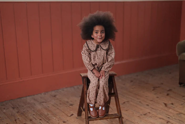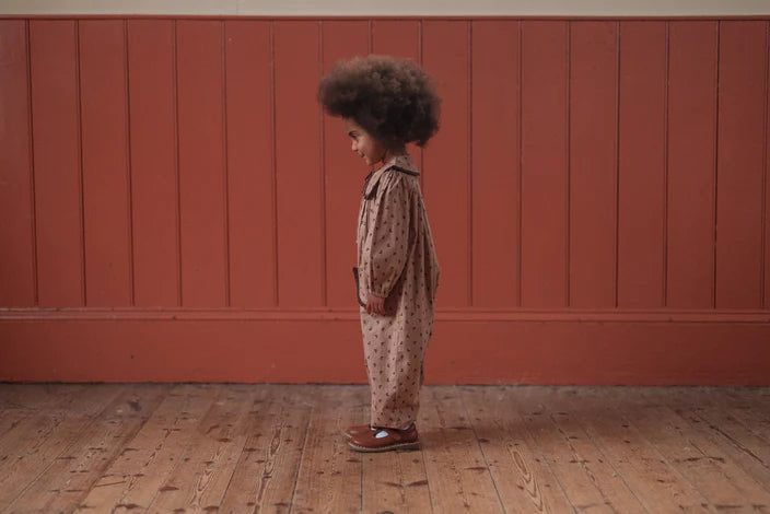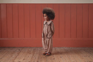 We are so excited about this new romper style for AW25! A full length romper made in our beautiful, organic rosehip floral fabric. This pretty, vintage inspired romper has an oversized collar with gathered fabric frill to the edge and patch pockets with trim. The romper is easy fitting, with lots of room to move and play. It has full sleeves with elastic cuffs and elastic to the ankle openings too. We've added a press-stud opening for easy changes and dressing.