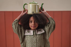 Our beautiful Malia dress is made in our organic Combe floral fabric. The contrasting sailor collar has pretty, floral, applique motifs and gathered cotton crochet trim to the edge. The dress has tucks to the shoulders and full sleeves finished with neat little button-up cuffs. This dress fastens with buttons to the front.