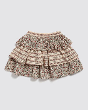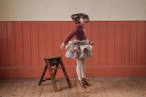 A lovely, full, ra-ra skirt, perfect for everyday or dressing up for parties. Looks great paired with our blouses or organic, jersey, pointelle t-shirts. Made from contrasting tiers of our organic floral fabrics. This skirt has an elasticated back waist.