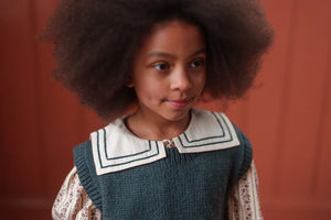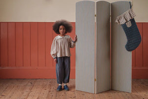 Our Petra blouse is pretty, vintage inspired sailor blouse made in our organic, mallory floral fabric. It has a white sailor collar with rows of contrasting velvet ribbon and full sleeves with velvet button-up cuffs. The perfect blouse to pair with our velvet trousers and our merino hand-knits.