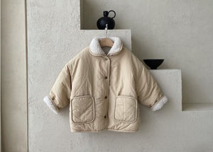 A much loved favorite of ours is back! This practical and comfortable winter coat is reversible and versatile. The padded one side is a classic style, whilst the teddy borg is super soft and warm. It has key features for a kids coat; both sides have pockets, the piped hem shows either way the coat is worn. It has easy to fasten stud buttons to the front, a wardrobe must have!