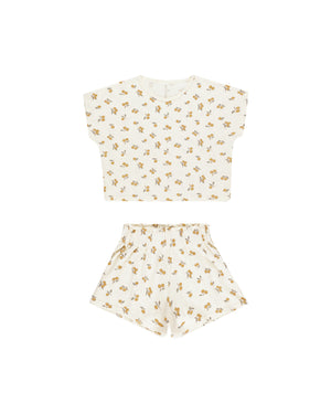 This comfortable set comes with a short sleeve top and coordinating shorts with an elastic waistline.