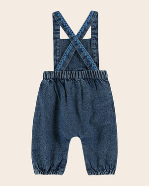 Baby overalls in blue denim cotton embroidered with blue leaf garlands on the waistband and all along the straps framing the bib, and a blue rose, embroidered in cross-stitch, brightens up the center of the bib.