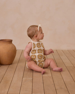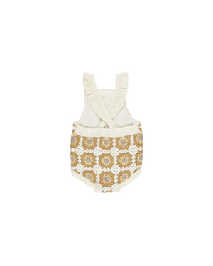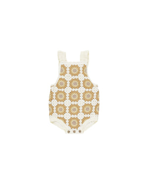 This Crochet Romper has ruffle criss-cross straps with a button back attachment, and bottom buttons for easy changes.