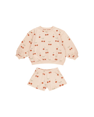A relaxed sweatshirt and matching shorts with pockets and an elastic waistband come together in this cozy french terry summer set.