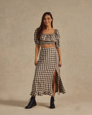 Our Sazan Top is a fun and flirty top to add to your closet! Featuring a cropped fit with billowy sleeves with elastic sleeve openings and an elastic waistband. Pair this top with our button slit skirt.